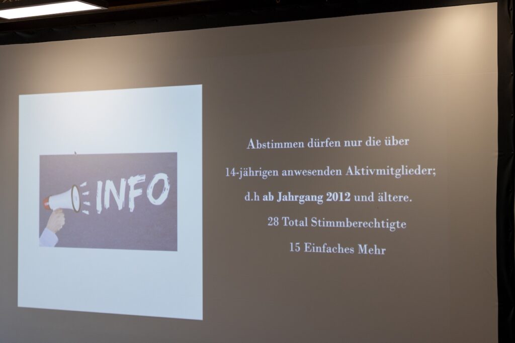 Der Start in den Morgen machte ein unterhaltsames Quiz mit Fragen über die vergangenen Vereinsjahre, bei dem Erinnerungen aufgefrischt und so mancher Lacher geteilt wurde. Anschliessend genossen die Anwesenden den traditionellen Brunch, der Raum für Austausch und gemütliches Beisammensein bot. Im anschliessenden Jahresbericht blickten wir auf ein gelungenes Vereinsjahr 2025 zurück. Unser Vereinsleben war geprägt von vielen gemeinsamen Aktivitäten, grossem Engagement und einem starken Miteinander. Zu den Höhepunkten zählten der Saisonstart im Frühling, das ETF in Lausanne sowie zahlreiche schöne Momente und Erfolge im Herbst und Winter – mit dem Schweizermeistertitel der Jugend als krönendem Abschluss. Auch sportlich durften wir uns über ein sehr erfolgreiches Jahr freuen: Insgesamt konnten 16 Podestplätze gefeiert werden (8 × Gold | 5 × Silber | 3 × Bronze). Ein besonderer Moment der Versammlung war die Ehrung unserer Jubilare: Herzliche Gratulation und ein grosses Dankeschön für euren Einsatz, eure Zeit und euer Herzblut: Mia (10 Jahre) · Kim (10 Jahre) · Nadja (20 Jahre) · Sara (21 Jahre) Zum Abschluss geht ein herzliches Dankeschön an alle Leiterinnen und Leiter, Helferinnen und Helfer, den Vorstand, die Eltern sowie alle Unterstützerinnen und Unterstützer. Ohne euren Einsatz wäre ein solches Vereinsjahr nicht möglich. Mit vielen schönen Erinnerungen und neuer Motivation freuen wir uns bereits auf das kommende Vereinsjahr.